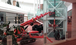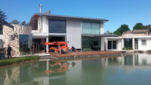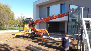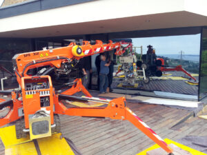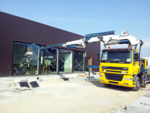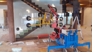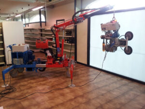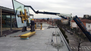 Servizio di sollevamento, movimentazione e assistenza alla posa di vetrate mediante l'utilizzo di attrezzature specifiche e personale specializzato.